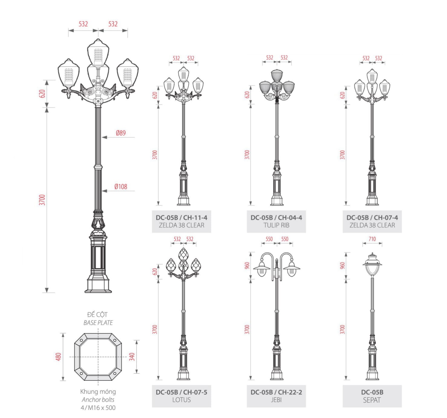 - Đế cột: Gang đúc
